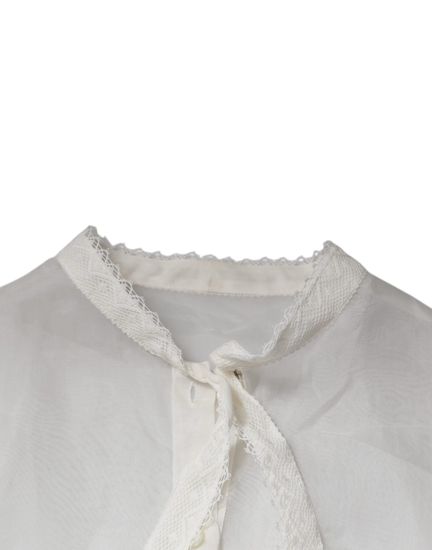Gorgeous brand new with tags, 100% Authentic Dolce & Gabbana white blouse is complemented by an ascot collar. The fitted model with long sleeves is made of fine silk jersey.