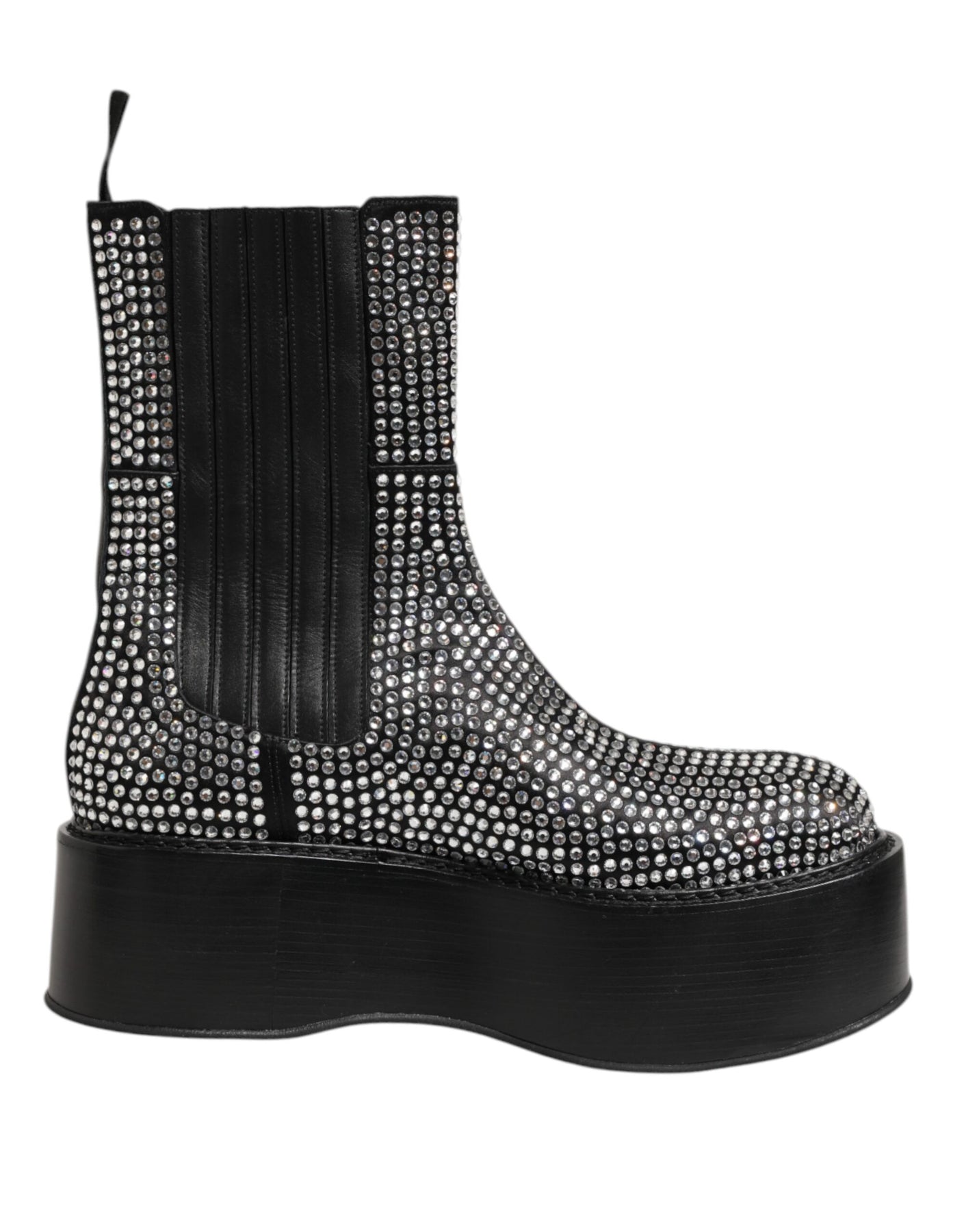 mid-calf boots, crafted in sleek black and adorned with dazzling crystal strass embellishments. The refined silhouette balances glamor and elegance, making them perfect for evening looks or adding a touch of sparkle to day-to-night ensembles. A statement piece for any luxury wardrobe.
